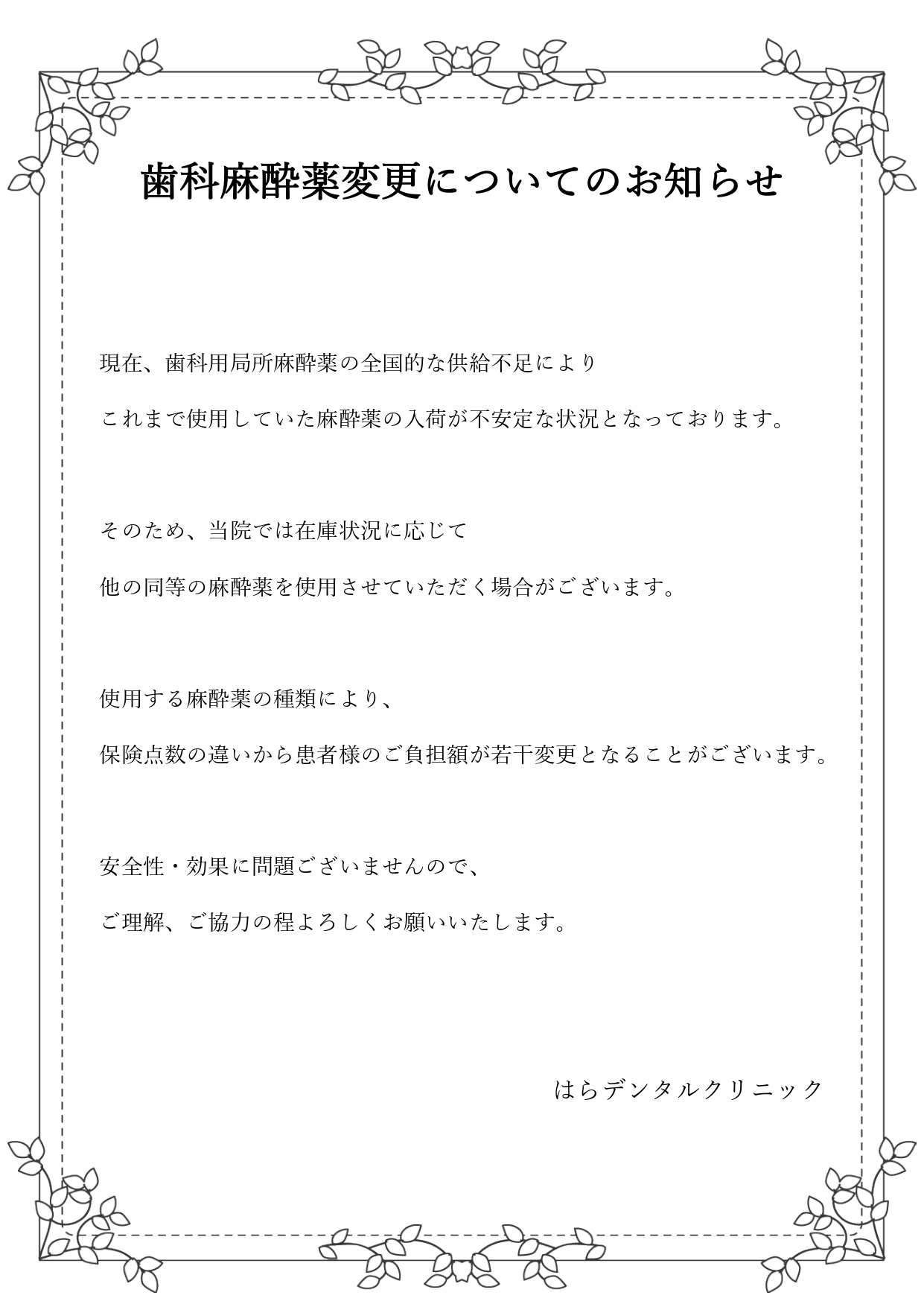 歯科麻酔薬変更についてのおしらせ